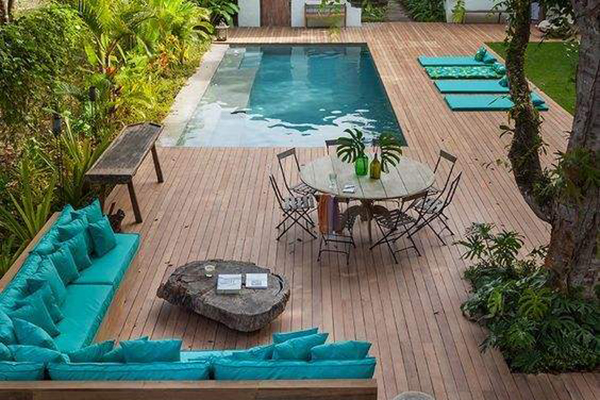 藏风聚气:泳池、喷水池等需要设计成圆形,四周水浅,朝向房屋建筑物方向微微倾斜,形成环抱效果,在风水中可以达到藏风聚气的效果,也可以增添花园空间的清新度和舒适度。